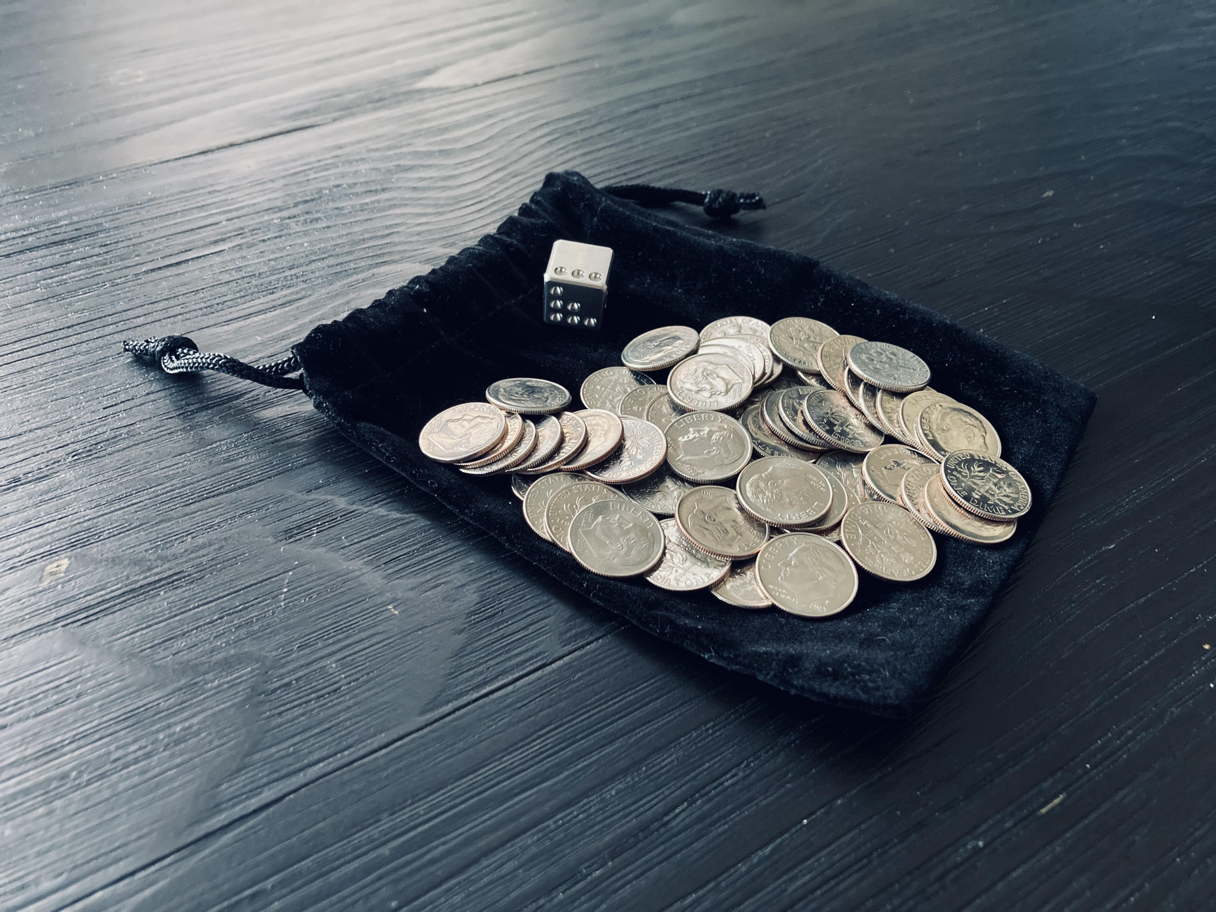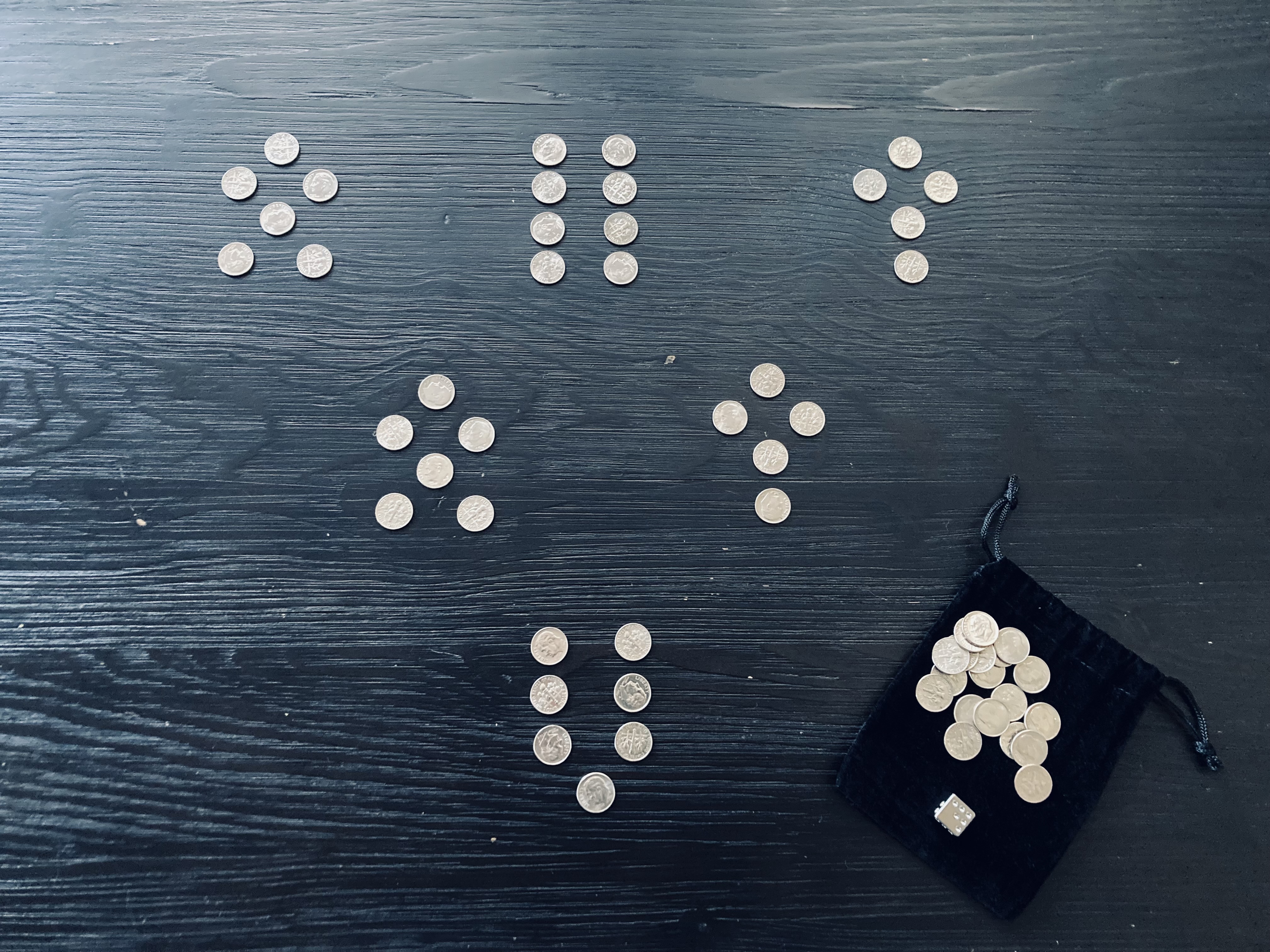 I’m still experimenting with pen-and-paperless methods of conducting geomancy readings, and recently devised yet another DIY kit for the novenary chart system. This particular setup requires 56 dimes (enough for all 4,096 possible charts and Ternions), a six-sided die, and a small pouch. I chose the lightest and smallest U.S. coin to reduce the overall weight of the kit. However, rather than a standard polymer die, I opted for a titanium variant (see below) in keeping with the metallic theme of this setup.